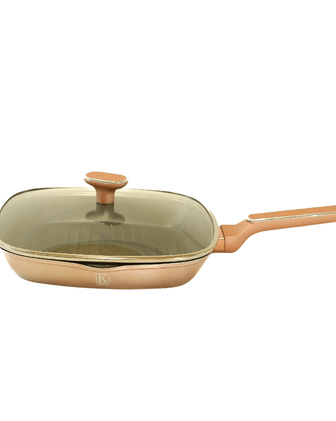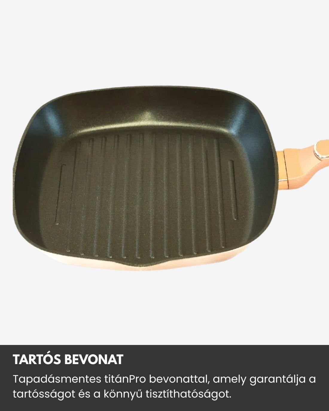 Emeld a főzés élményét a RoseGold Collection Grill serpenyővel, amely a modern konyhák elengedhetetlen eszköze. Ez a serpenyő nemcsak praktikus, hanem stílusos is: elegáns rosegold színe és letisztult formavilága bármilyen konyhában jól mutat, így nyugodtan kihelyezheted a pulton, nem kell elrejtened a fiókban.
