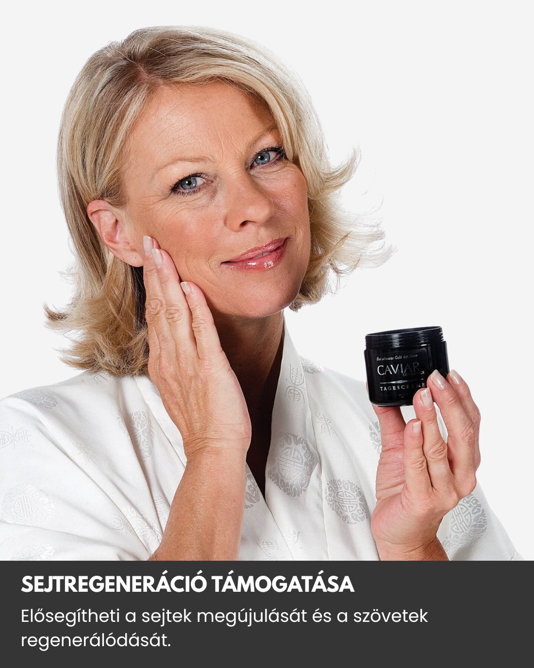 - Hatékony ránctalanítás és regeneráció: A kaviárban található aminosavak, telített zsírsavak és vitaminok serkenthetik a sejtek szaporodását és a szövetek regenerálódását, így a bőr simább, rugalmasabb és fiatalosabb lehet. Csökkentheti a ráncok hosszát és mélységét, különösen a szemkörnyék finom vonalainál.