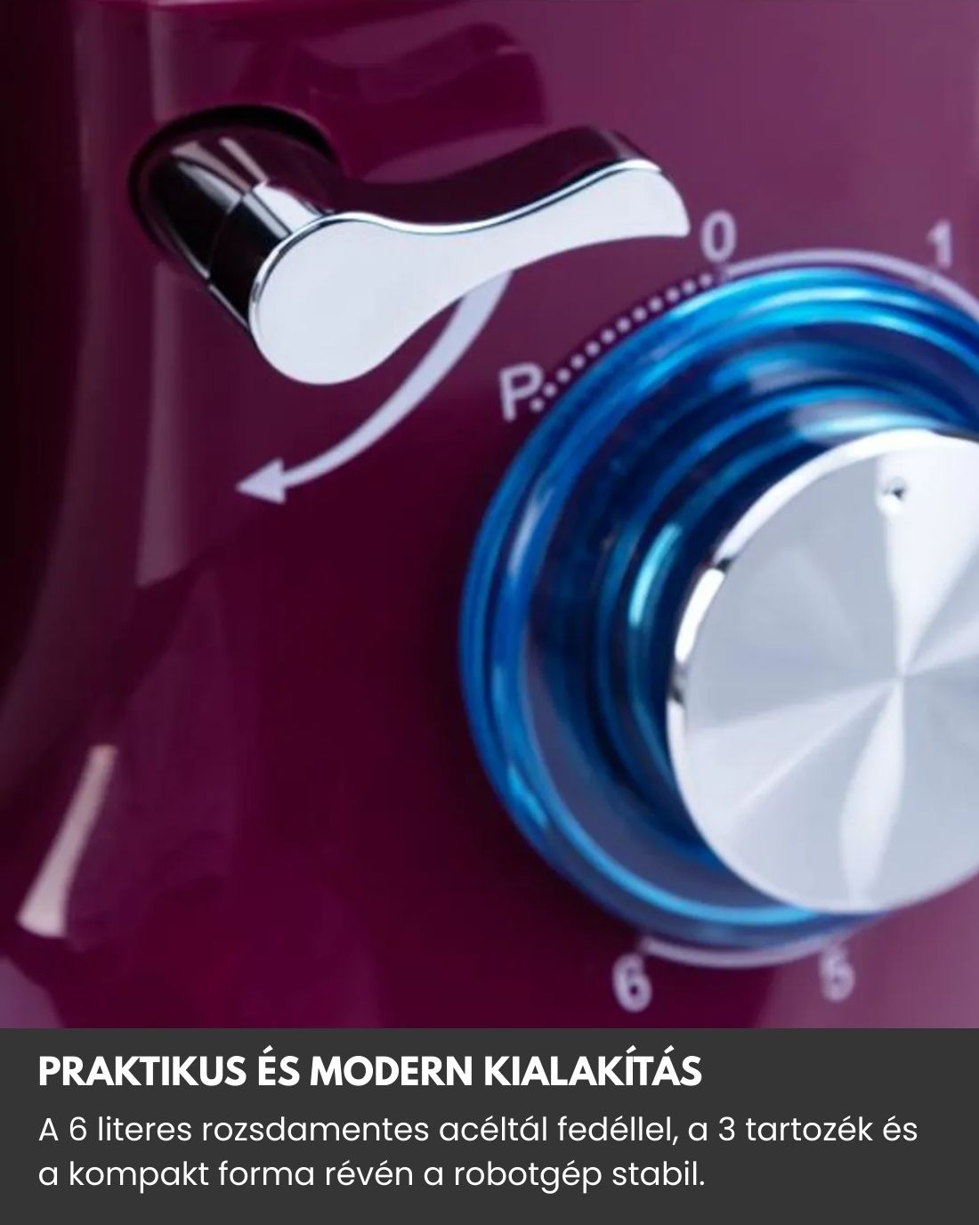Ez a kompakt és nagy teljesítményű robotgép megkönnyíti a mindennapi főzést és sütést. Az 1500 W-os motor, a 6 sebességfokozat és az impulzus üzemmód biztosítja a gyors és hatékony munkavégzést dagasztáshoz, keveréshez és habveréshez. A 6 literes rozsdamentes acél tál ideális nagyobb adagok elkészítéséhez is. Csúszásgátló lábai stabil használatot garantálnak, modern lila színe és LED-es vezérlése pedig stílusos megjelenést ad konyhájának.