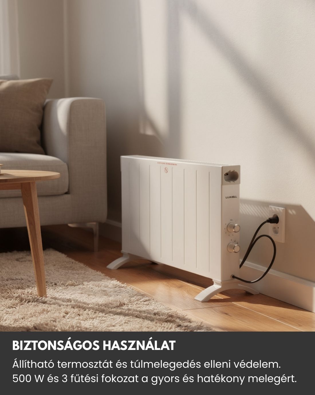 A konvektor mobil és könnyen mozgatható, de igény szerint akár falra is szerelhető, így maximálisan rugalmasan alkalmazkodik az Ön igényeihez. Modern, fehér színű kialakítása elegánsan illeszkedik bármely helyiségbe.
