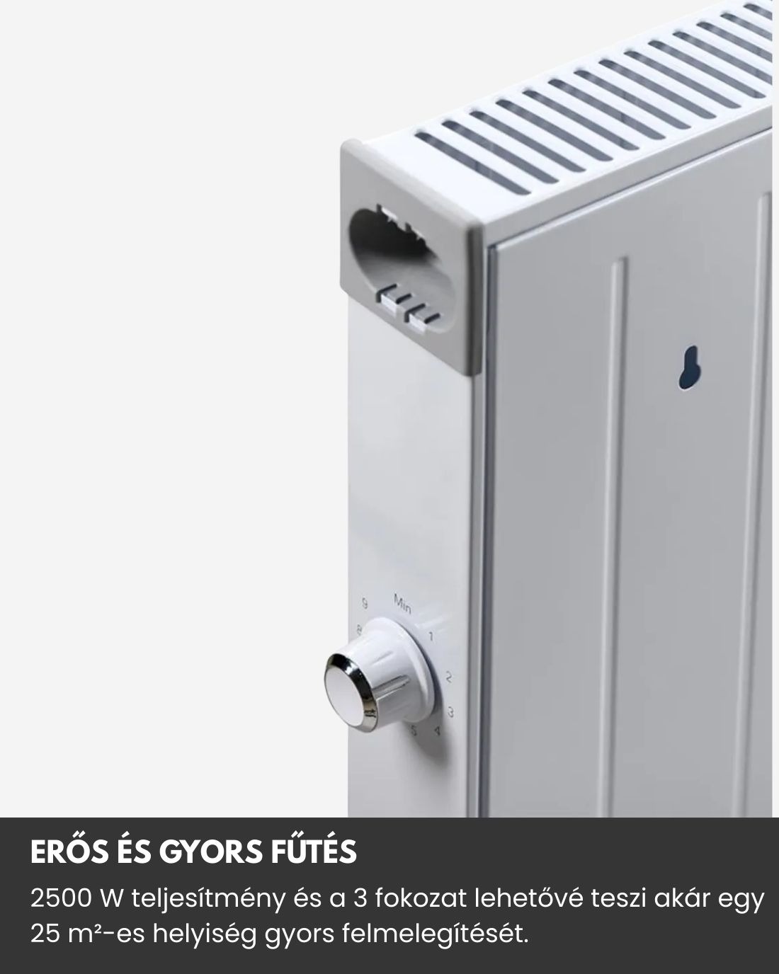 A készülék 2500 W teljesítménye lehetővé teszi a gyors helyiségfűtést akár 25 m²-es területen, miközben három teljesítményfokozat áll rendelkezésre (1000W / 1500W / 2500W), így mindig a kívánt hőmérsékletet tarthatja fenn. Az állítható termosztát segítségével pontosan szabályozható a helyiség hőmérséklete, a készülék pedig automatikusan leáll, ha túlmelegedne, így biztonságos használatot biztosít.