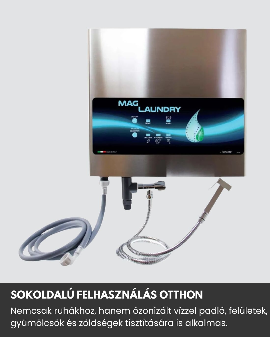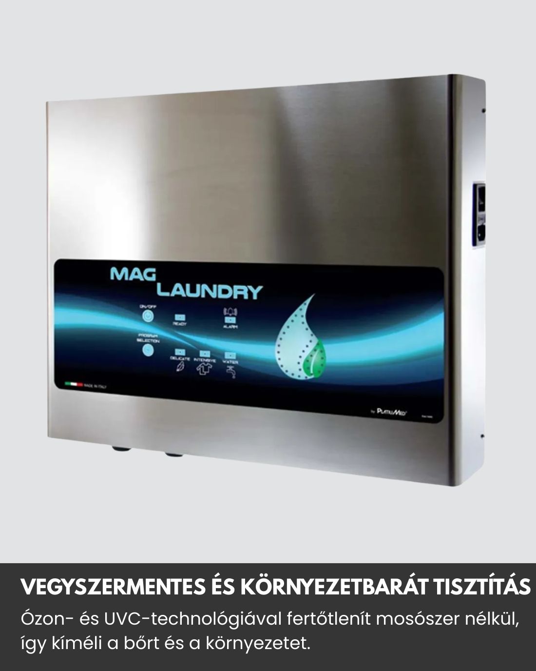 A Mag Laundry mosógéphez csatlakoztatható, ózon- és UVC-technológiával működő készülék, amely vegyszermentes, antibakteriális tisztítást biztosít. Ózonizált, baktériummentes vizet juttat a mosógépbe, így friss és higiénikus ruhákat eredményez. Gazdaságos, környezetbarát megoldás, hideg vízzel javasolt használattal.