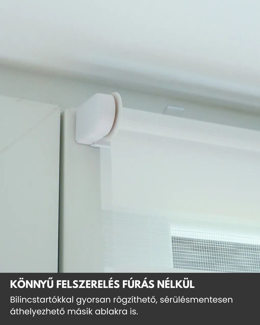 A roló 4 bilincstartóval rögzíthető, így fúrás nélkül telepíthető 17–30 mm vastag ablakkeretekhez. Szükség esetén a roló eltávolítható és áthelyezhető egy másik ablakra, anélkül, hogy sérülne az ablak vagy a roló.