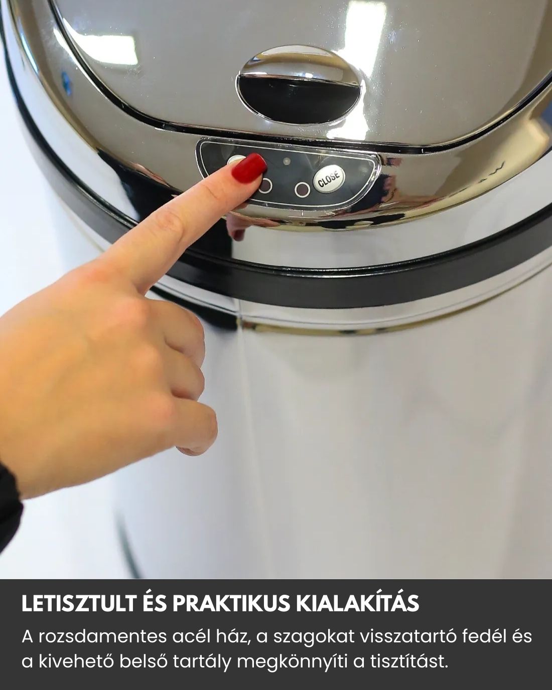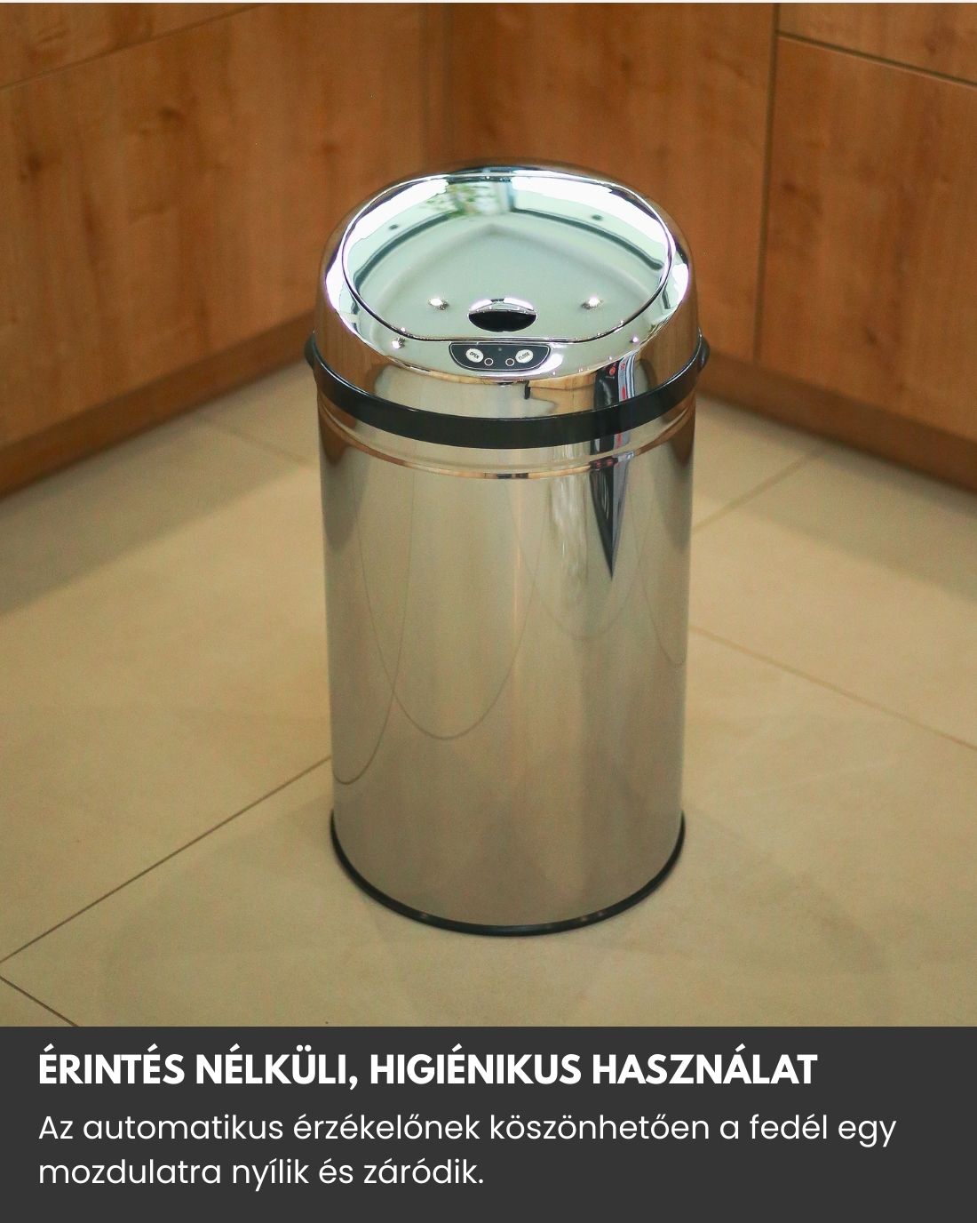 Ez a rozsdamentes acélból készült automatikus érzékelős szemetes tökéletes választás minden olyan helyiségbe, ahol fontos a higiénia és a kényelem: konyhákba, fürdőszobákba, irodákba vagy nagy forgalmú helyekre.