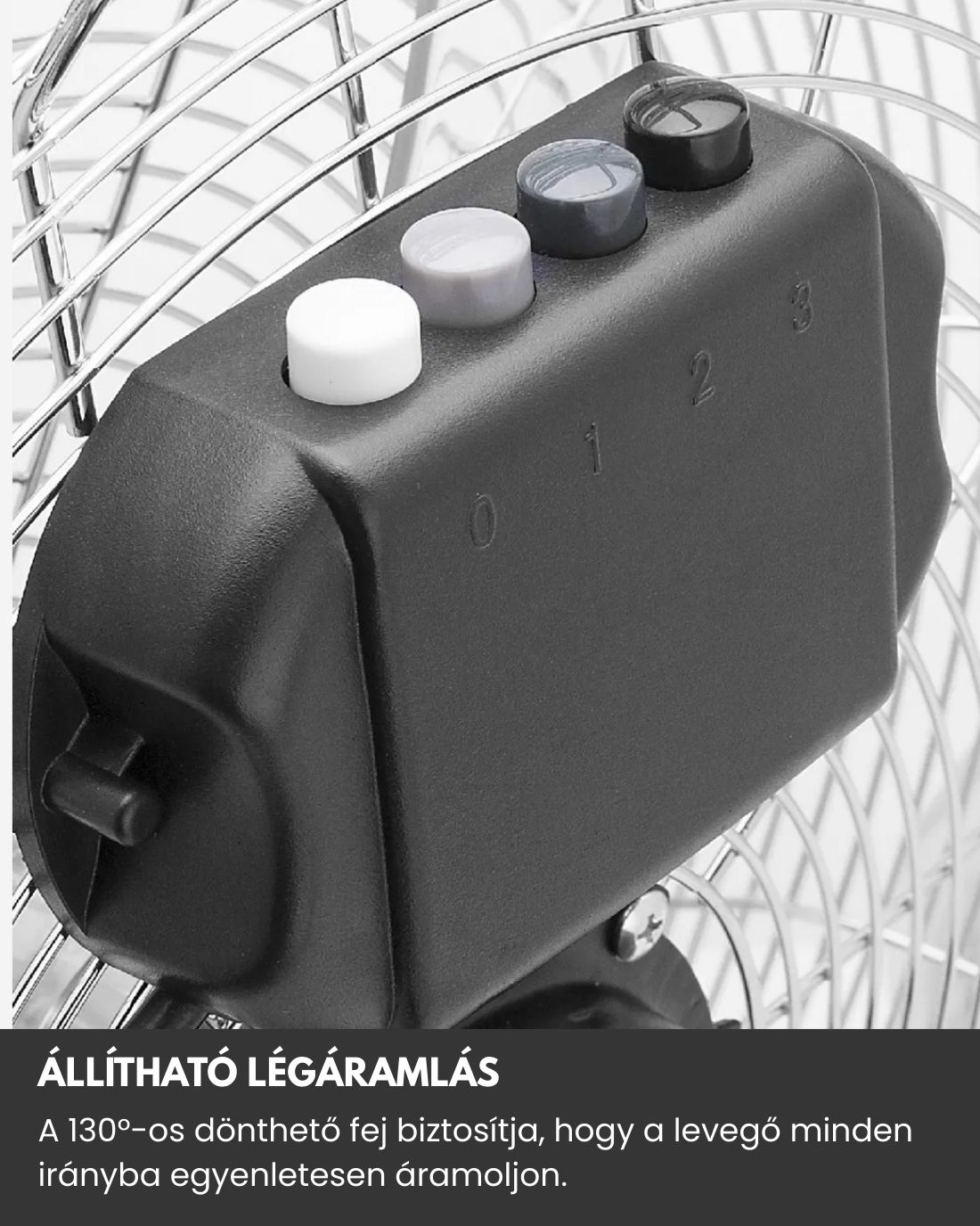 A ventilátoron 3 különböző sebesség közül választhat. Az erőteljes 70 W-os motor rövid idő alatt hűti le az egész helyiséget. 130 fokos dőlésszöggel a levegő minden kis sarokba eljut.