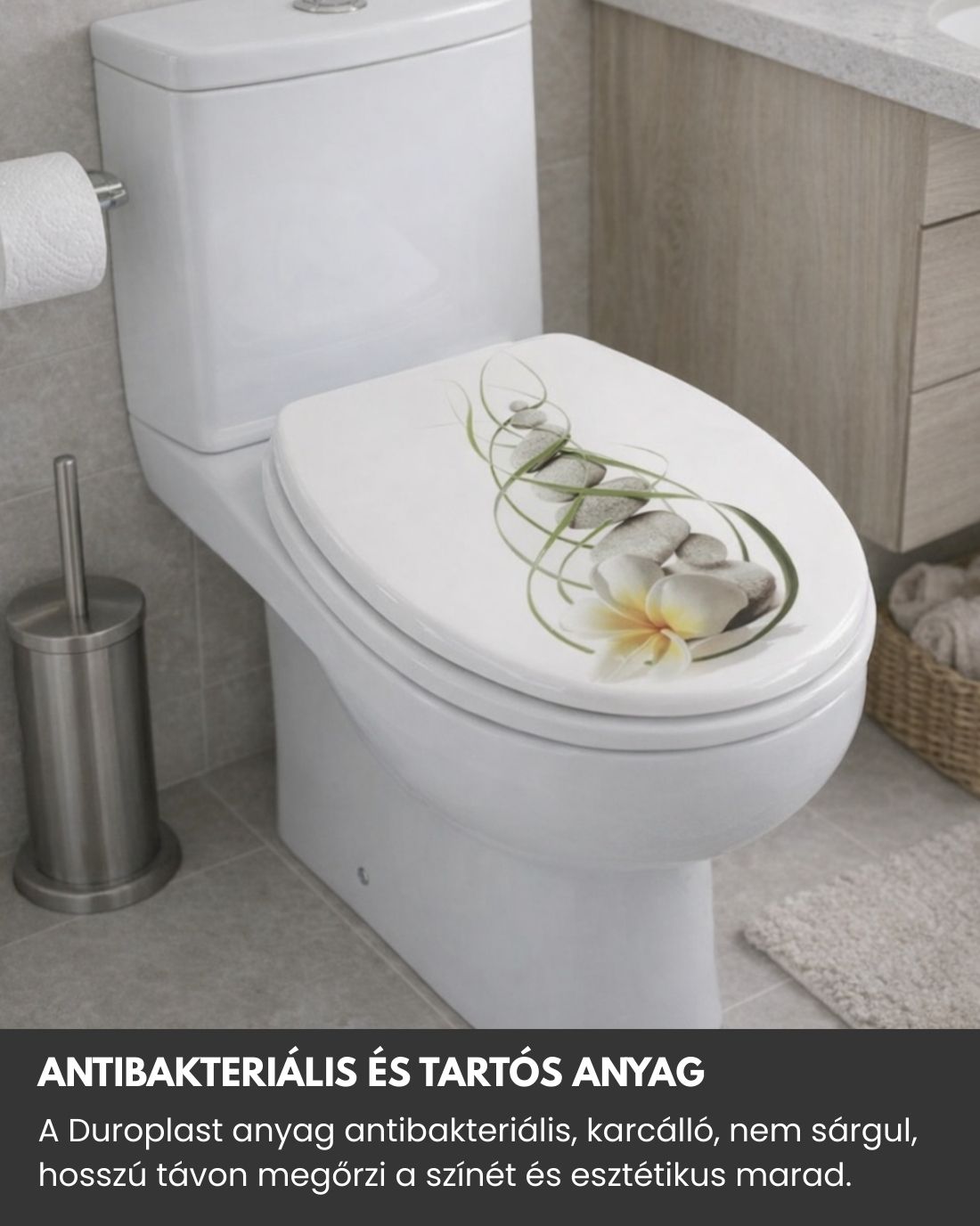 A WC-fedél antibakteriális Duroplast műanyagból készült. Ez lehetetlenné teszi a baktériumok és szennyeződések lerakódását a sima felületen.