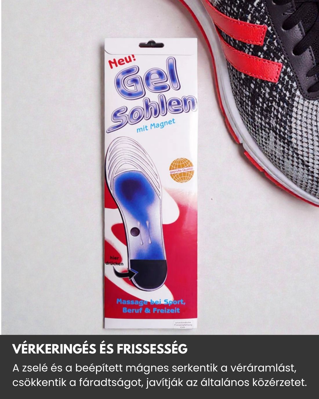 A talpbetétben elhelyezett különleges zselé akupresszúrás talpmasszírozást biztosít, amely serkentheti a láb vérkeringését és a szervezet biológiai működését.